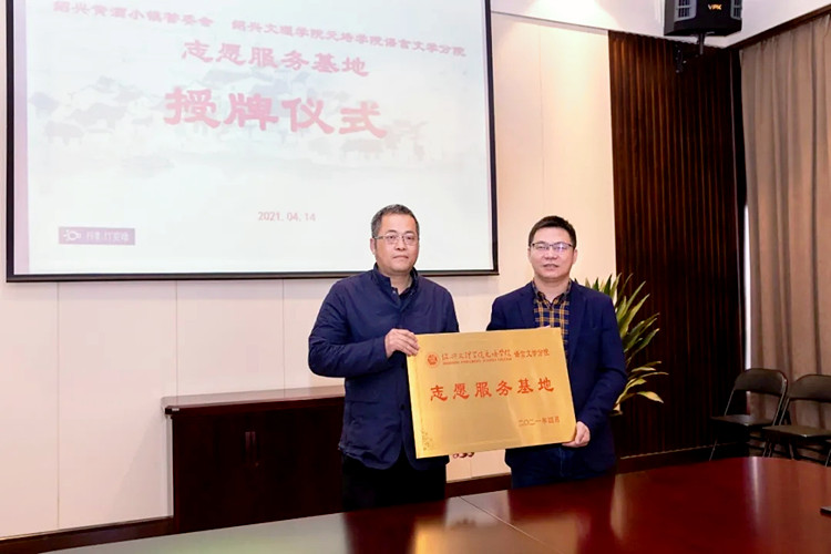 语言文学分院党总支书记授予绍兴黄酒小镇管委会志愿服务基地牌,绍兴黄酒小镇管委会副主任张朵朵接牌