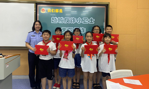 为提高小学生识诈反诈能力,保护小学生及家长的财产安全,切实发挥少先队员接班人作用。8月4日,在越城公安分局的指导下,学院大学生反诈志愿团携手北海小学镜湖校区407班梦马中队同学开展识诈、反诈宣讲活动。