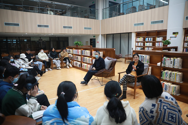 沈红卫在清幽书香中娓娓道来自己的读书经历,从读书使人知书达理、读书让人安静和自我调节、读书让人学会独立思考和思辨、读书是未来生存的能力等四个方面交流读书的意义。他语重心长地寄语在座学生,要充分认识读书的重要性,利用大学美好时光,调整自身节奏,好好读书,通过读书了解时代发展方向,有效建立自己的竞争力,为踏上社会做好准备。
