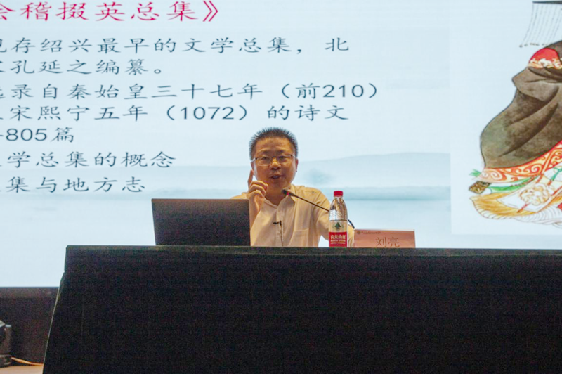 《会稽掇英总集》是绍兴现存最早的一部地方文学总集。刘亮结合自身研究方向作“《会稽掇英总集》与浙东唐诗之路”主题报告,循着编者孔延之的生平,将在场师生引入到越地灿烂迷人的文化世界中,以其独具特色的诗文校勘,带领众人探索浙东唐诗发展之路,领略浙江越文化的无限风光。