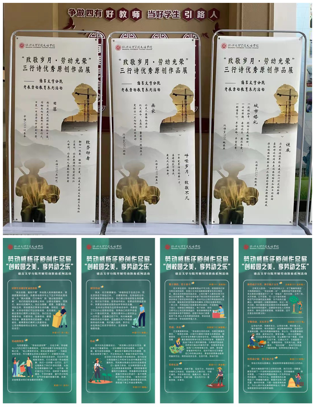 在三行诗、感悟征集活动中,分院学子以文聚力,记录自己的所思所想,在文字中真切流露对各行各业劳动者的赞扬。目前,三行诗、感悟征集已在分院大厅流动展出。在海报设计活动中,同学们以笔绘蓝图,将自己对新时代的劳模精神、劳动精神、工匠精神的理解注入作品中。 此外,同学们在主题朗读活动中“以声传情,以情带声”,抒发对劳动者发自内心的敬佩之情;在摄影活动中,以光影为墨记录劳动者辛勤的身影;在原创推文活动中,以一篇篇图文并茂的推文宣扬劳模精神,展现昂扬向上、踔厉奋发的精神面貌。