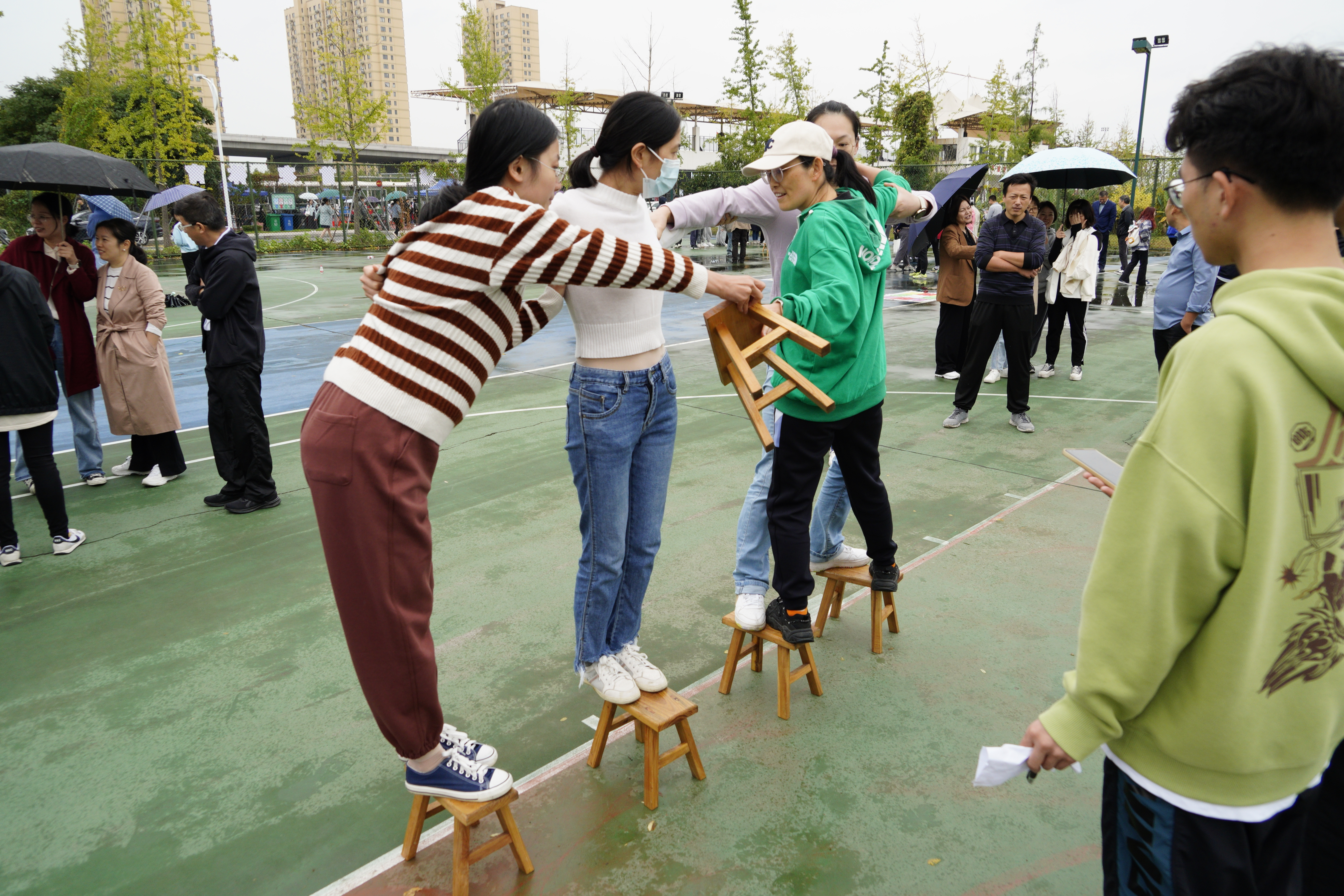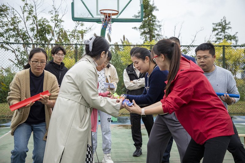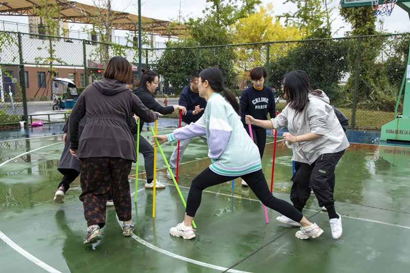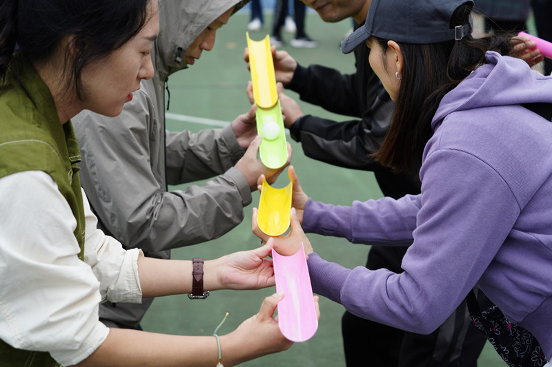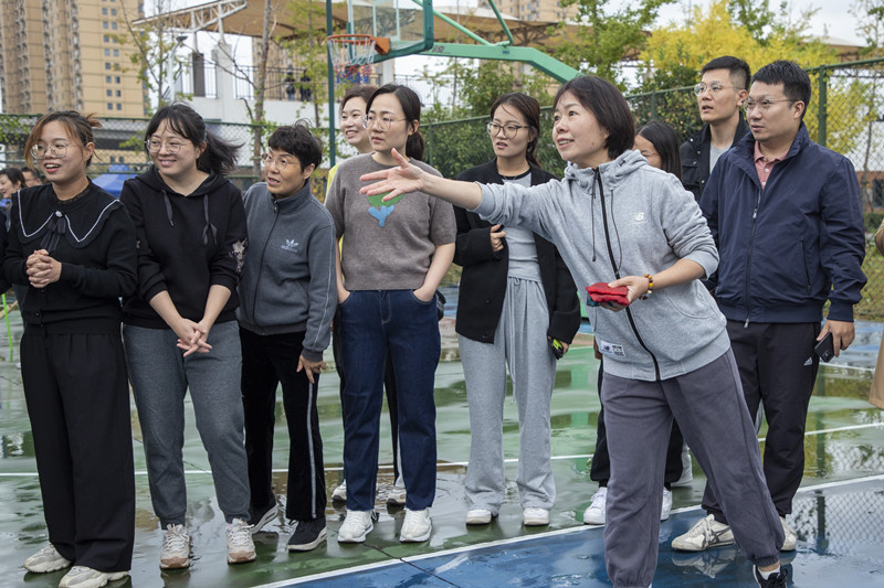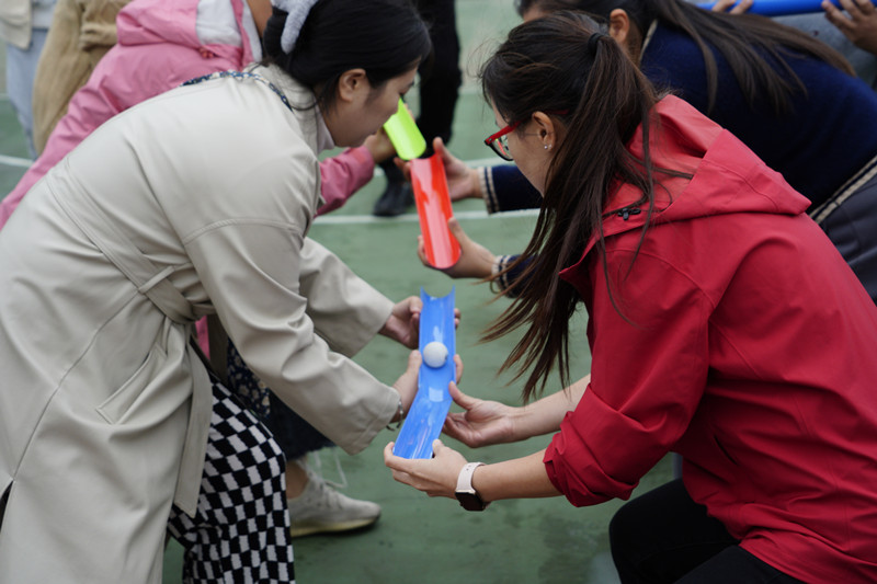 比赛中,老师们认真研究着“不倒森林”的小秘诀:“身体一定要笔直”,高喊整齐的口号“1212”。“同心击鼓”以鼓声奏响华美乐章,弓着步,弯起腰,随着排球的飞跃跳动着,向上向上再向上,铿锵有力的鼓声传达出大家昂扬的斗志和进取的精神。“板凳接龙”诠释了若想走得远,必须先走得稳,每一个人手搀着手,肩扶着肩,将小小的板凳传得既快又稳。“沙包掷准”要求瞄准目标,迅速挥臂,各队伍或用力,或轻柔,尽显神通,沙包在天空划过一条优美的弧线。“珠行千里”则要求将乒乓球从一端连续传递到另一端,在保证速度的同时考验互相配合的默契。