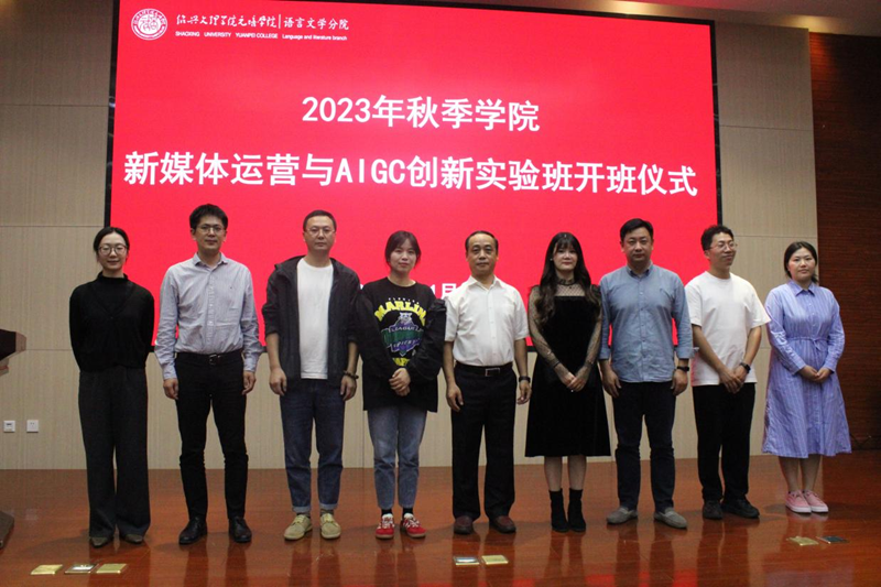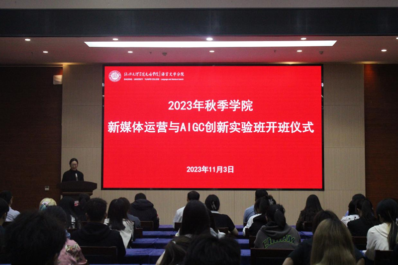 11月3日下午,语言文学分院“新媒体运营与AIGC创新实验班”开班仪式在图书馆828会议中心举行。学院副院长周思红、绍兴悠扬文化传媒有限公司总经理陆建祥、市网络达人专委会会长樊宇楠、语言文学分院党政负责人、专业导师韩晓等出席仪式。