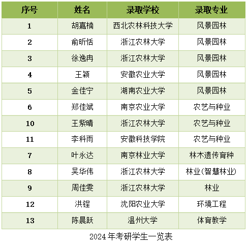 “今年的考研佳绩,得益于园林专业学科交叉性强、考研专业选择性广的特点。”据分院相关负责人介绍,园林专业开设设计和植物两个方向,课程设置为考研提供多样化的选择。设计方向可选择风景园林规划与设计、风景园林工程与技术、国土景观保护与生态修复、城乡规划、风景园林植物与应用等相关专业;植物方向可选择园林植物应用与生态修复、园林植物与观赏园艺、植物学、环境工程等专业,还可以选择林学相关的智慧林业、森林保护、林木遗传育种等专业,以及与农业相关的农艺与种业专业,考研专业多元化在一定程度上增加了园林专业学生的考取率。