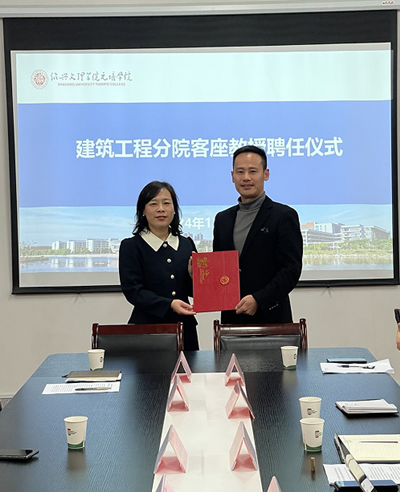 绍兴农创客会长、绍兴市秦望茶业有限公司总经理汤帅亮受聘为建筑工程分院客座教授。他表示,将不遗余力地推动更多大学生走进乡村、了解乡村、爱上乡村,投身乡村创业,为乡村振兴贡献青春力量。俞国芬为汤帅亮颁发聘书。