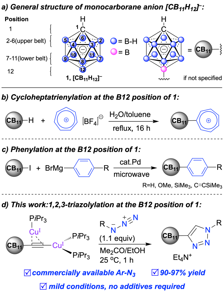 在现代合成化学研究的前沿,寻找创新合成方法构建复杂分子结构一直是科研人员的核心任务。碳硼烷阴离子[CB11H12]⁻作为一类具有独特结构和电子性质的化学物质,在配位化学、合成化学、材料科学和药物化学等多个领域具有重要应用。然而,由于其多面体结构和高度电子缺乏的性质,碳硼烷特别是在其不同位置的选择性功能化上,面临诸多技术挑战。
