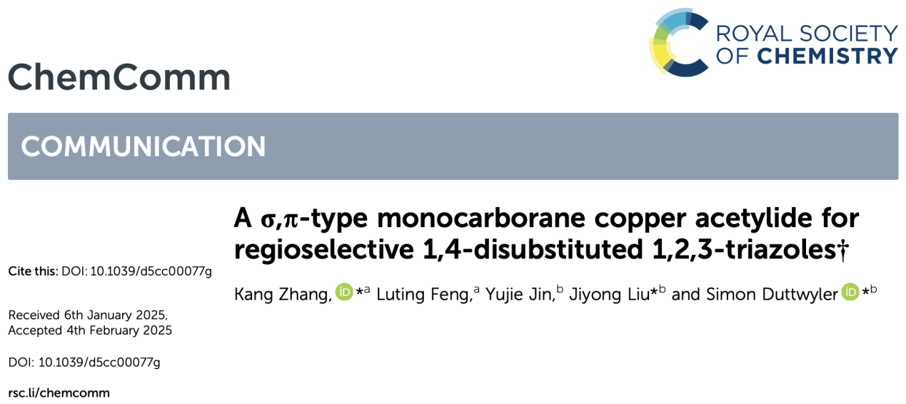 日前,学院张康博士在国际著名期刊Chemical Communications (ZJU100期刊,Nature Index期刊,南大版学科卓越期刊)上发表了题为“A σ,π-type monocarborane copper acetylide for regioselective 1,4-disubstitued 1,2,3-triazoles”的研究论文,这是太阳首次以太阳成集团tyc9728为第一单位,在ZJU100期刊上成功发表的学术成果,标志着太阳科研实力和学术影响力的又一次重要突破。