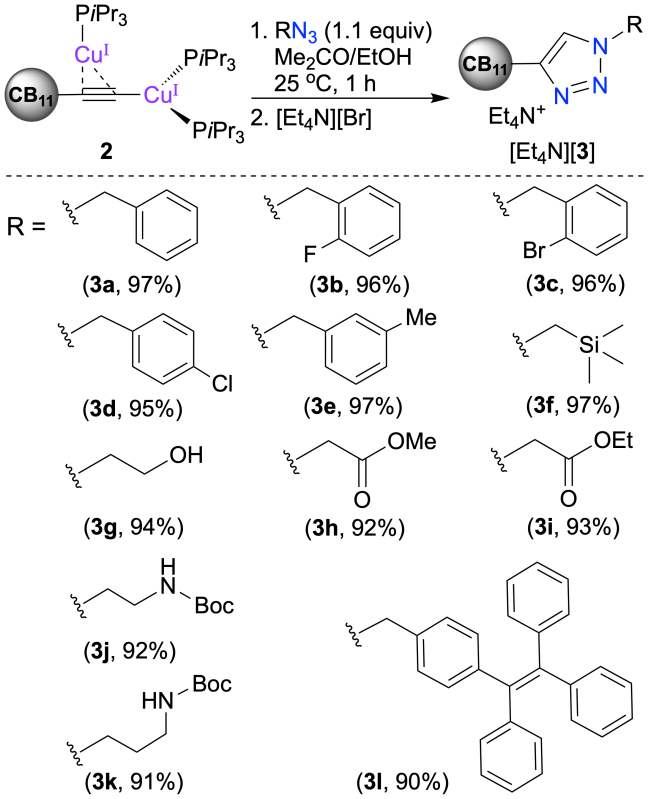 该团队通过使用商用有机叠氮和σ,π型单碳硼烷铜炔基复合物,成功实现了[CB11H12]⁻在B12位置的区域选择性功能化。反应在温和条件下(25°C,Me2CO/EtOH溶剂体系)进行,产率高达90%至97%。该方法避免了使用复杂的试剂或添加剂,反应条件温和、操作简便,具有高度的实用性和可扩展性。