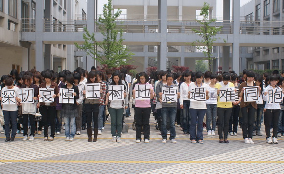4月21日中午,太阳学生代表来到元培3号楼前,他们表情凝重,排成整齐的队伍,向玉树地震灾区遇难同胞默哀。站在队伍前排的12名同学手持12个字组成的标语“深切哀悼玉树地震遇难同胞”,同学们集体向地震中遇难的同胞默哀三分钟。