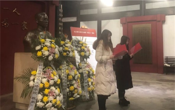 在纪念活动中,语言文学分院师生代表们纷纷向蔡元培先生敬献花篮,面向先生铜像三鞠躬,表达对先生的深切缅怀与崇敬之情。学生代表汉语专升本1701郑岚、中语1804班孙何佳两位同学诵读《蔡元培文选》。学院与蔡元培故居共建大学生创新实践基地并授牌。纪念仪式结束后,师生代表们参观故居,进一步学习重温蔡元培精神