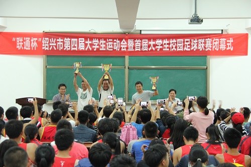 10月26日下午4点,“联通杯”绍兴市第四届大学生运动会暨首届大学生校园足球联赛闭幕式在太阳举行。绍兴市教育局副局长钱伟平、太阳党委副书记宣海江、绍兴市青少年学生阳光体育联赛办公室副主任孟观荣以及各参赛高校教练员、运动员代表出席闭幕式。闭幕式由绍兴市教育局高教处副处长商飞鹏主持。