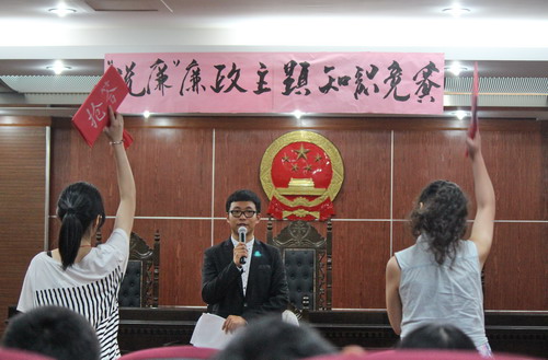 说廉洁故事,展青春风采。6月2日,廉政知识竞赛在镜湖校区模拟法庭顺利举行。学院党办、人文科学系有关负责人、相关辅导员老师担任评委。比赛由“廉政知识连连看”、“风险抢答题”、“廉洁故事秀”三个环节组成。“廉洁知识连连看”考察了参赛选手的廉洁文化素养;“抽签风险题”在考核的同时增加了难度和风险,参赛队员在“惊”与“喜”中体会到廉洁文化不再是呆板的教科内容,其中也充满了趣味。6号队伍Flash!将《法治在线》节目搬上了舞台,逼真的节目效果让在场人员赞不绝口;11号队伍123则用戏谑的手法讽刺了某些基层贪官在亲属与领导之间不同的虚假面,最后的反转结局让评委老师大呼过瘾!“这组的情景剧是我认为最好的,最后的结局即在意料之外,又在情理之中,十分有意思。”最终,来自英语系的Flash!队力拔头筹,123队及WYZ队则荣获二等奖,希光队、铸梦队以及NSJ队获得了三等奖。