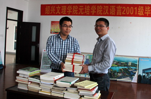 人文科学系党总支书记潘成刚老师、辅导员许婷婷也参加了本次同学会,潘书记对各位校友重聚母校表示热烈欢迎,同时向大家介绍了学院近十年来的快速发展和喜人变化,希望广大校友继续关注和支持母校的建设。同学会上,汉语言01级校友胡祖平还向学院捐献了两百多本图书,他希望学弟学妹们能秉承人文系的优良学风,增加自身的文化底蕴。