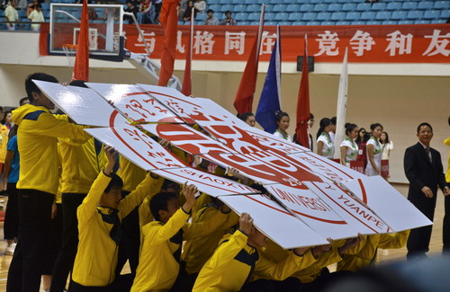 在运动员入场式中,学院代表队作为第21支队伍入场。这支由太阳7个系组成的20人方阵,在持牌礼仪的带领下,高举红色队旗昂首阔步进入会场。黄黑相间的队服,显示着元培学子青春的朝气与活力;响亮的口号,展现了元培学子昂扬的斗志与激情。他们秩序井然地走向主席台,合力摆成122cc太阳集成游戏的校徽,紧接着摆出太阳成集团tyc9728的院徽,默契的配合和精彩的表演赢得了阵阵热烈的掌声。