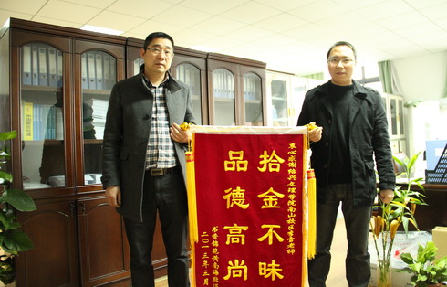 3月13日上午10点多钟,学院办公室来了一对夫妇,一人手持锦旗、一人手捧鲜花,二话不说,一定要见到学院的领导,办公室工作人员甚至被他们弄糊涂了。在几经安抚下,这对夫妇终于平静下来。黄南海先生说:“我无论如何也没想到,自己丢了这么多的东西竟然失而复得,十分激动,十分感谢,本来打算11日上午就赶过来送鲜花和锦旗,可是做锦旗最少需要三天的时间,只好今天过来了。我们就是想通过这种方式感谢李雪老师以及贵校。”黄先生十分激动地回忆到,当时钱包里没有名片,也没有其他任何的联系方式,李老师找到他是通过他的身份证在网上搜索到的线索。仅仅在网上查找信息就花了李老师一个多小时的时间。功夫不负有心人,经过了一个多小时的搜索后,最终李老师查到了一条黄先生所在公司去年招聘安全员的信息,于是就按照上面的电话试着给公司打过去,对方便告诉了他老总的电话。可是太不凑巧了!老总当时他正在外地出差,人还在飞往厦门的飞机上,没有接到电话,由于是陌生号码,所以也没有及时回复。第二天,李雪老师又继续联系,终于打通了公司老总的电话,并查明该公司确实有黄南海先生此人。