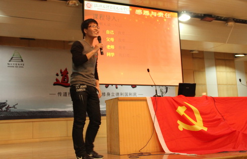 此前,学院宣讲团成员易朗朗同学也来到该校,以“感恩与责任”为主题,为业余党校的学员讲述了青年应具有的感恩意识和责任担当精神。讲座以中学生熟悉的感人故事为案例,引起了学生的强烈共鸣。易朗朗表示,对于中学生来说,他们正值人生价值观的形成期,作为学长,以自己的理解和他们分享这样的话题可以起到很好的效果,今后如果有机会还愿意继续站在讲台上与他人一起分享自己对感恩与责任的理解。