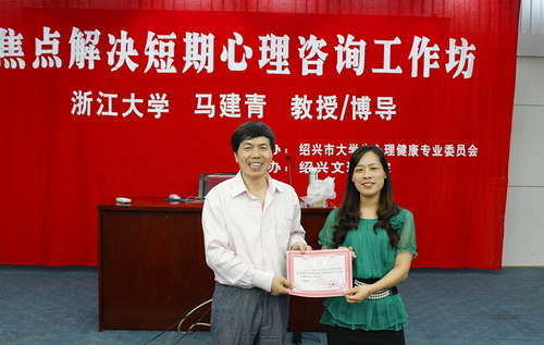 马建青教授为俞国芬老师颁发焦点技术培训结业证书
