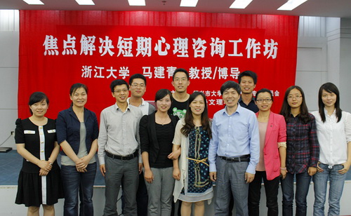 马建青以其扎实的专业知识、丰富的咨询经验、多元化的教学手段以及生动活泼的教学方式,就焦点解决短期心理咨询(SFBT)的形成背景、概念、特征、咨询理念、框架流程以及常用技术等问题一一展开讲解,通过案例分析、现场演练,分享等环节使得整个教学不仅深入浅出,现场气氛活跃。现场的每位老师都深深的为马建青教授热情投入的讲解所感染。