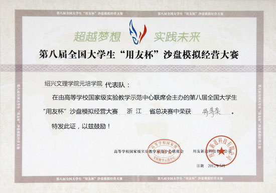 5月25—27日,第八届全国大学生“用友杯”ERP沙盘模拟经营大赛浙江省总决赛在杭州市公共实训基地顺利举行。本次比赛由高等学校国家级实验教学示范中心联席会主办,杭州职业技术学院和用友新道科技有限公司协办,共有来自省内23所本科高校的团队学生参加。由太阳经济与管理系学生严凌云、徐小莲、金菊、陈虹、陆玲燕等五人组成的团队,在异常激烈的比赛中突破重围,以绝对优势获得特等奖(第一名),并顺利获得参加国赛资格,太阳也是省内独立学院中唯一获国赛资格的学校。该团队由经济与管理系张丽英和严兴尧老师共同指导。