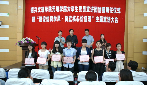 5月11日下午,太阳大学生党员宣讲团讲师聘任仪式暨“建设优良学风·树立核心价值观”宣讲大会在一号楼报告厅举行。院党委书记章融,党委副书记魏春初,院长助理、学工部部长俞国芬出席了本次会议,各系党总支负责人及有关辅导员参加了会议,仪式由党办、院办副主任金超主持。