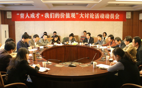 章融书记指出,社会主义核心价值体系是兴国之魂,是社会主义先进文化的精髓。要以建设社会主义核心价值体系为根本,广泛开展核心价值观大讨论活动,提炼社会主义核心价值体系,形成普遍认同,为学院建设和发展提供坚强思想保证和强大精神动力。要从做什么、怎么做以及怎样才能做好这三个方面入手,推动核心价值观讨论活动取得实效。要以育人成才为目标,强化学风、教风建设,引导学生努力读书,在学业上取得优异成绩。教师要认真专研业务、提升教学水平,为促进学院教风建设做出贡献。要全院动员、全员参与,利用一切资源扎实推进核心价值观的讨论活动。要加强服务意识,提高执行力和工作标准,争取通过本次讨论活动促进优良教风、学风的进一步形成。