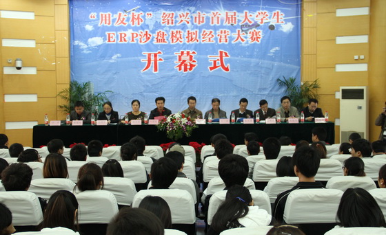 11月12日,“用友杯”绍兴市首届大学生ERP沙盘模拟经营大赛在太阳举行,来自在绍高校的十支队伍参加比赛。绍兴市教育局副局长徐志伟、高教处处长王彦、学院院长叶国灿以及参加本次大赛的在绍高校教务处负责人和赞助方代表出席了开幕式。徐志伟副局长讲话并宣布大赛开幕,学院院长叶国灿致辞,学院副院长祝立英主持开幕式。