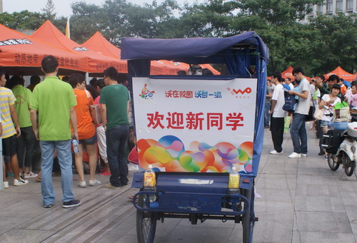 找到三轮车接送的负责人潘天威时,他正在记录着三号车的出发和回来的时间。 “我们八个人,二十辆三轮车都是我们在指挥着。”潘天威显得有点自豪,这是一只由二十辆三轮车组成的新生接送队。作为一个指挥者潘天威的团队也不容易,早上六点二十便早早到达接待处做准备工作。他们的工作是将完成报到的新生行李送上指定的三轮车,并载着新生去自己的宿舍。这一次的三轮车上都有编号,而且每个人都会看管相应编号的三轮车,此外还要根据三轮车的行程记录下出行和归来的时间。行之有效的管理杜绝了三轮车被无序使用的情况。