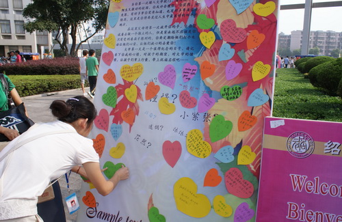 “新生从各地赶来,即将在一个全新的环境里生活,在没有了中学的紧张学习压力之后会出现心理适应等方面的问题”,外语系党总支副书记、心理学出身的陈跃男老师从专业的角度看待这个问题,作为系里学生工作的负责人,陈老师早已在暑假期间做了系列规划。而在新生报到处设置“心愿墙”则是系列规划的第一步。新生或家长在完成报到手续后会领到一张心形的彩色卡片,他们会在卡片上写下美好的心愿贴到“心愿墙”上。“希望在老师的精心培育下茁壮成长”、“新的学期、新的开始”、“爱上这里”等等充满希望和憧憬的话语帖到了墙上。陈老师说,这些卡片将被保留下来,10月份左右将开展一次反馈活动,把新生开学第一天的表现再反馈给他们。通过让新生自我憧憬、自我励志的办法引导他们找到归属感、尽快适应大学生活。