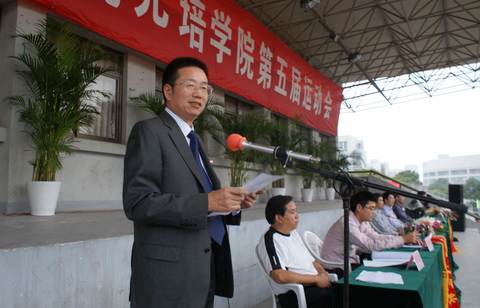 叶国灿院长代表学院行政和党委,向为本届运动会做出不懈努力的师生表示衷心的感谢,向取得优秀成绩的同学表示热烈的祝贺。本次运动会共有7支代表队525名运动员参加了比赛,在36个比赛项目的争夺中,共产生了36个冠军。经济与管理系一队等三个代表队获得团体总分前三名,外语系等三个代表队获得“精神文明奖”。