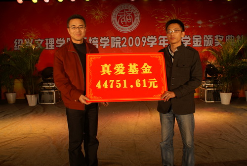 颁奖典礼上,魏佩敏副书记代表学院接受了工程与技术系叶柳波同学的“真爱基金”捐赠,全院2049名学生参加了捐赠,共募得善款44751.61元。